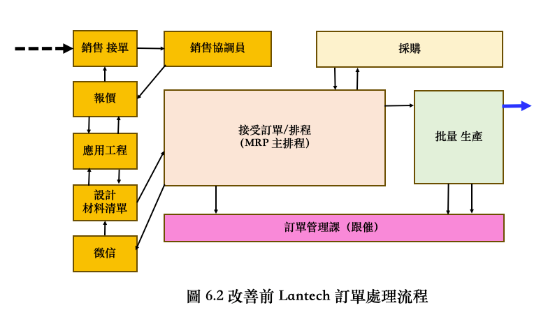 终于把订单连同bom一起送到排程课,排入主排程表。由于工厂内的订单流程常常容易出错,因此,销售部内特设了一个订单管理课,负责协调卖(厂方)买(配销商)的进度并跟催。图6.2为订单的流程示意图。