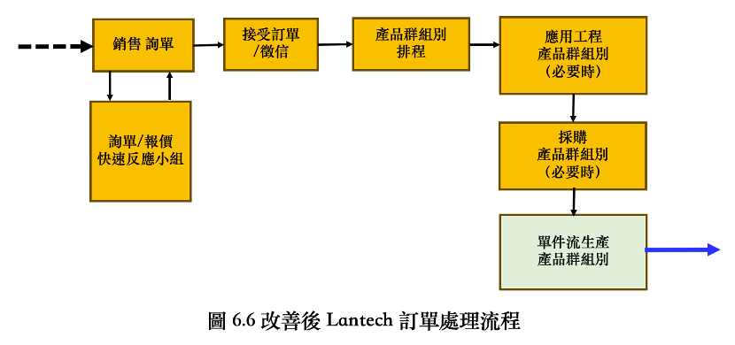 随着工厂内如火如茶地推行精益转型,也该把注意力放在事务流程上,特别是处理订单流程上。正如蓝卡斯特所言:「我们希望办公室人员能见贤思齐。如果你能在十四小时内制造出一部机器,那么光是处理订单就得花上三周,这象话吗?」例如某个案最为特则,工厂在四天就交货了,而征信部却尚未完成作业–不幸的是后来发现买方已经破产了。