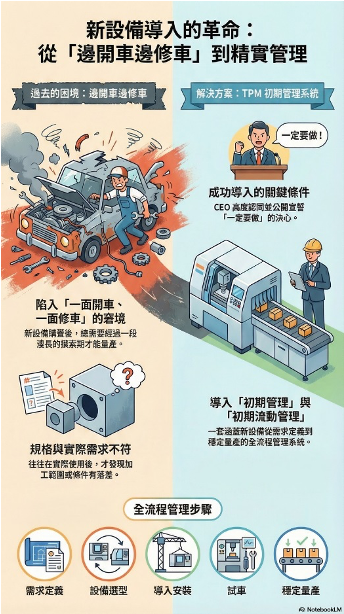 tpm的「初期管理」与「初期流动管理」,不仅是产品开发与设计的管理系统,更涵盖新设备从需求定义开始,历经选型、导入、安装、试车,直到稳定量产为止的全流程管理。