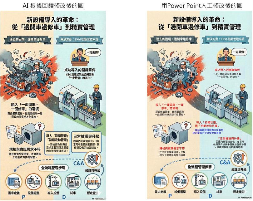 根据群组好友的专业建议,我尝试引导ai重新修改流程图,过程中却遇上棘手的「ai字型幻觉」,导致图中文字出现乱码且难以修复(如下左方图档)。即便投入大量时间反复调校仍未果,所幸在好友的及时指导下,我改以power point「手工补丁」的方式进行文字修正,最终顺利克服了技术瓶颈,完成下右方的修正图档。